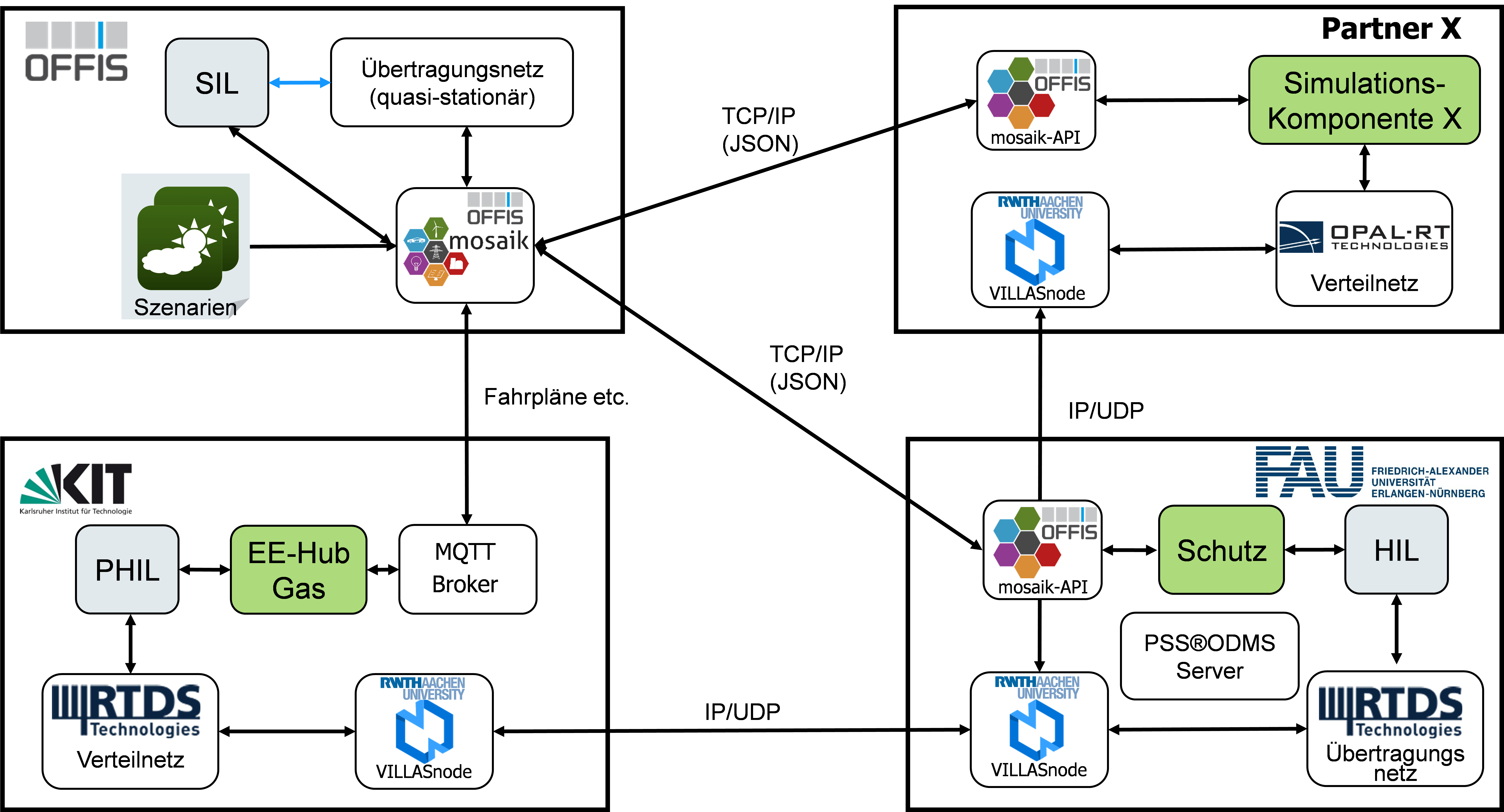 Die Basis für viele Untersuchungen sind gemeinsame Netzmodelle, welche ebenfalls unter Beteiligung des Lehrstuhls für Elektrische Energiesysteme entwickelt werden. Über eine verteilte Echtzeitsimulation wird ermöglicht, Reallabore in die Evaluationsumgebung einzubinden, beispielsweise um Regelalgorithmen zu erproben und anhand der realen Systemantwort weiterzuentwickeln. Folgende Abbildung zeigt den Aufbau der Evaluationsplattform und die Plattform betreibenden Partner.