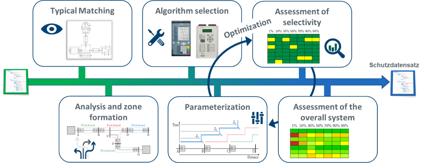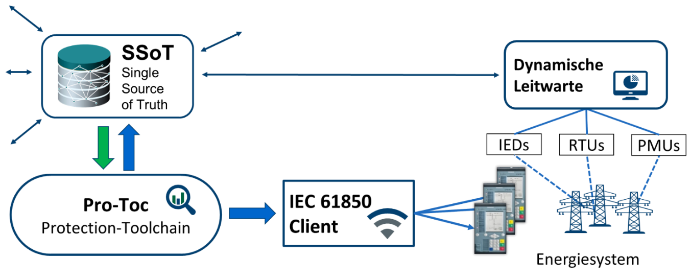 Ein weiteres Teilgebiet des Lehrstuhls für Elektrische Energiesysteme der FAU umfasst die Konzeptionierung und Pilotierung eines hoch flexiblen Assistenzsystems zur automatisierten und adaptiven Schutzkonzepterstellung. Aufgrund der ambitionierten Ziele der Deutschen Bundesregierung den CO2 Ausstoß drastisch zu reduzieren, Kohle- und Nuklearkraftwerke abzuschalten, sowie die Anzahl an Erneuerbaren Energien stetig zu steigern, unterliegen die elektrischen Übertragungs- und Verteilnetze starken strukturellen Veränderungen. Dies hat zur Folge, dass auch die Einspeise- und Fehlersituationen sich verändern und immer komplexer zu beherrschen sind. In der heutigen Praxis werden Netzschutzkonzepte von Experten auf Basis langjähriger Erfahrungswerte und unter fragmentarischer Zuhilfenahme von digitalen Werkzeugen einmalig erstellt und danach nur noch selten angepasst. Die Erstellung besteht aus der Auswahl der Schutzfunktionen und der Schutzalgorithmen sowie der Berechnung der Schutzparameter in enger Koordination mit der vorliegenden Netzstruktur. Trotz der zukünftig zunehmenden Komplexität haben sich die Methoden der Schutzkonzepterstellung bisher kaum fortentwickelt. Das in diesem Projekt zusammen mit der Siemens AG und der Technischen Universität Ilmenau entwickelte Assistenzsystem (Pro-Toc = Protection Toolchain) besteht aus verschiedenen Bausteinen und Werkzeugen, die flexibel miteinander kombiniert werden können. So entsteht eine automatisierte Werkzeugkette, die abhängig der aktuellen Netzstruktur, des Netzzustandes, angeschlossenen Erzeugungsanlagen und weiterer Kriterien das optimale Schutzkonzept vorab errechnet. Eine Übersicht des Aufbaues der Pro-Toc ist in den unten stehenden Abbildungen dargestellt. Nach Fertigstellung kann das sichere Schutzkonzept samt aller berechneten Werte exportiert und zurück in das digitale Abbild geladen werden. Außerdem sollen die Parameter dann auf die im Feld befindlichen adaptiven Schutzgeräte automatisiert übertragen werden.